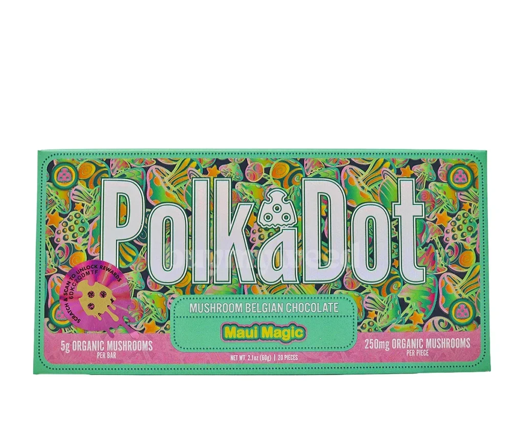 Polka Dots Shroom Chocolate in Maui Magic flavor contains 5 grams of premium psilocybin mushrooms, offering a tropical and smooth way to experience a psychedelic escape.